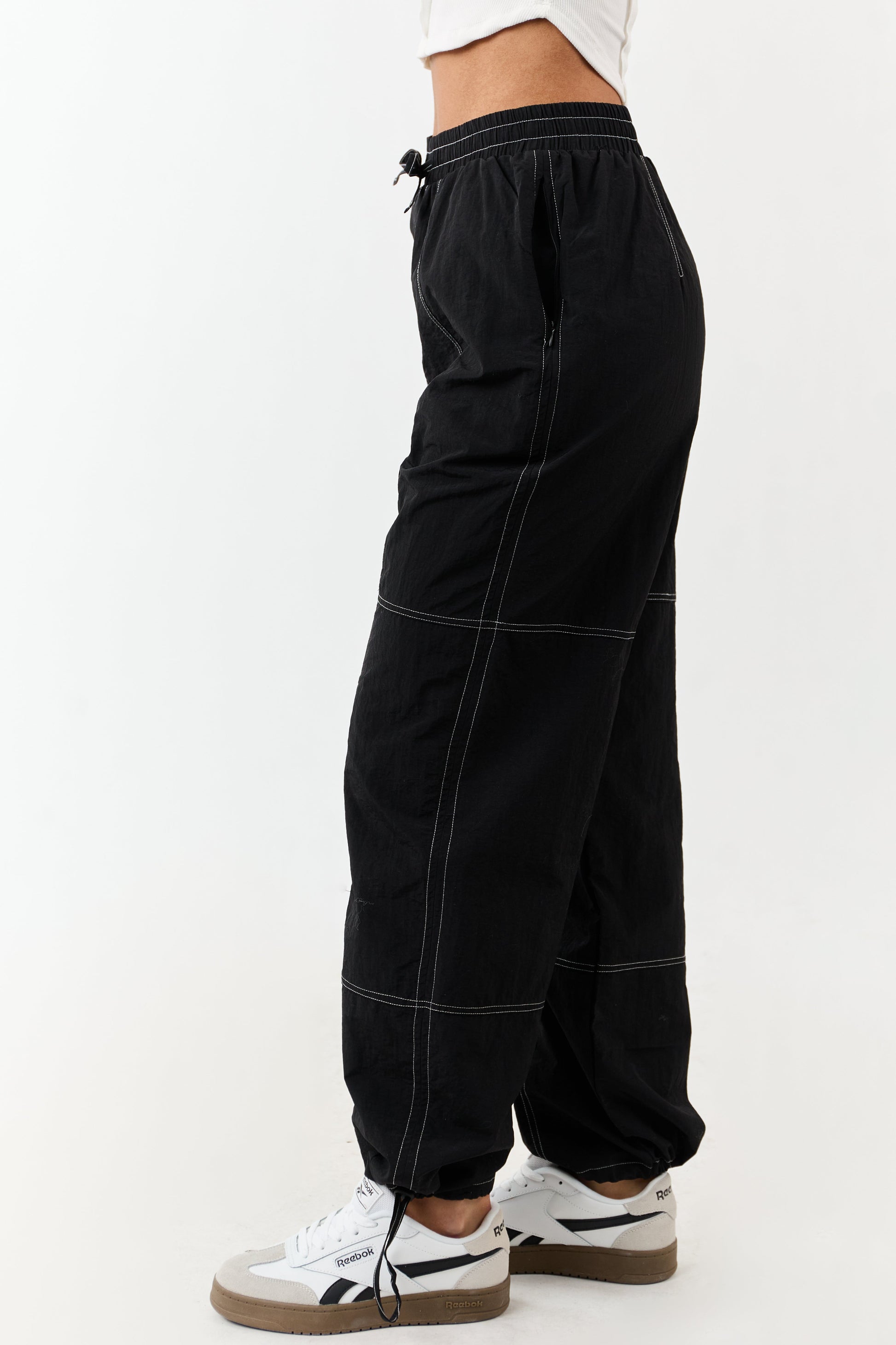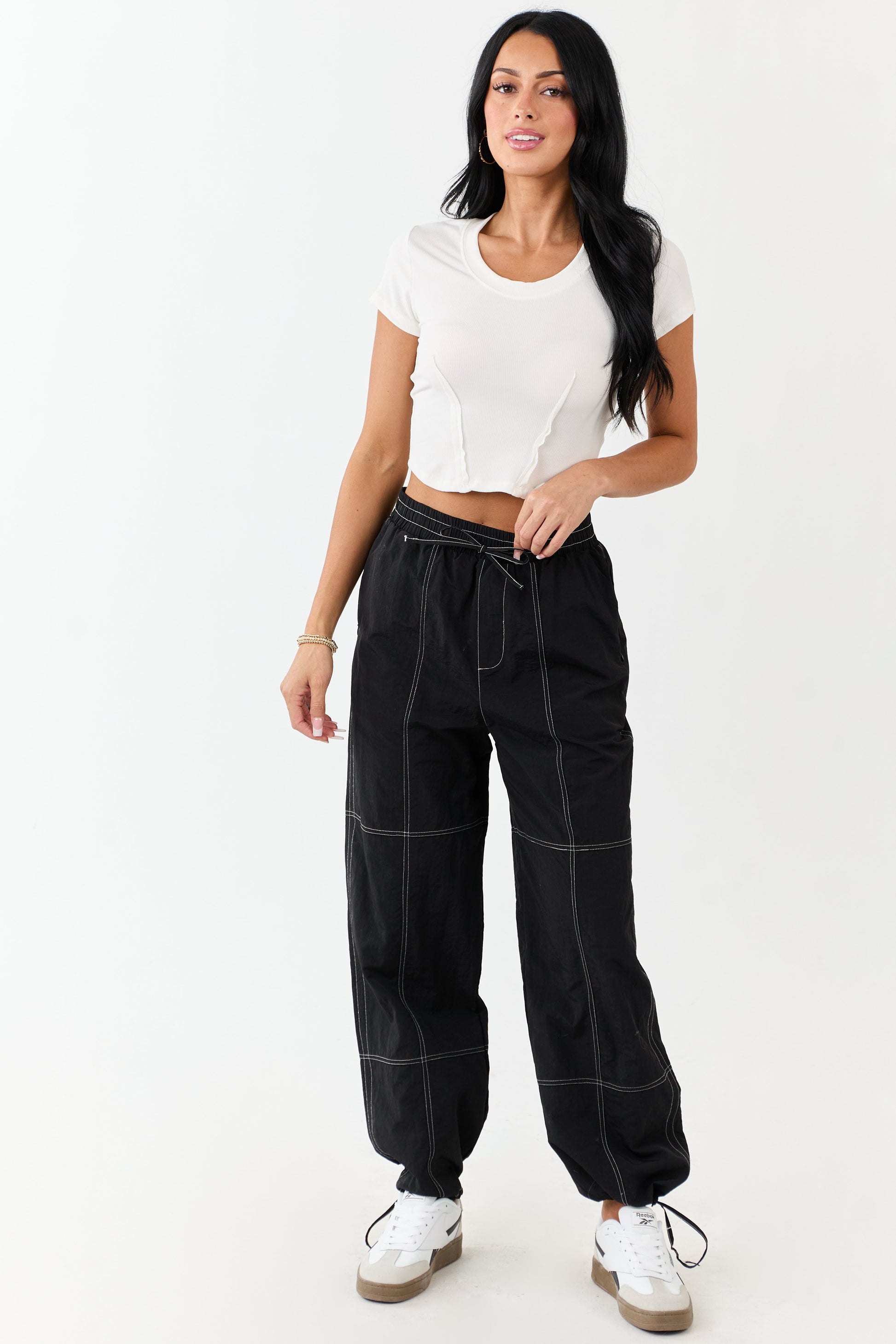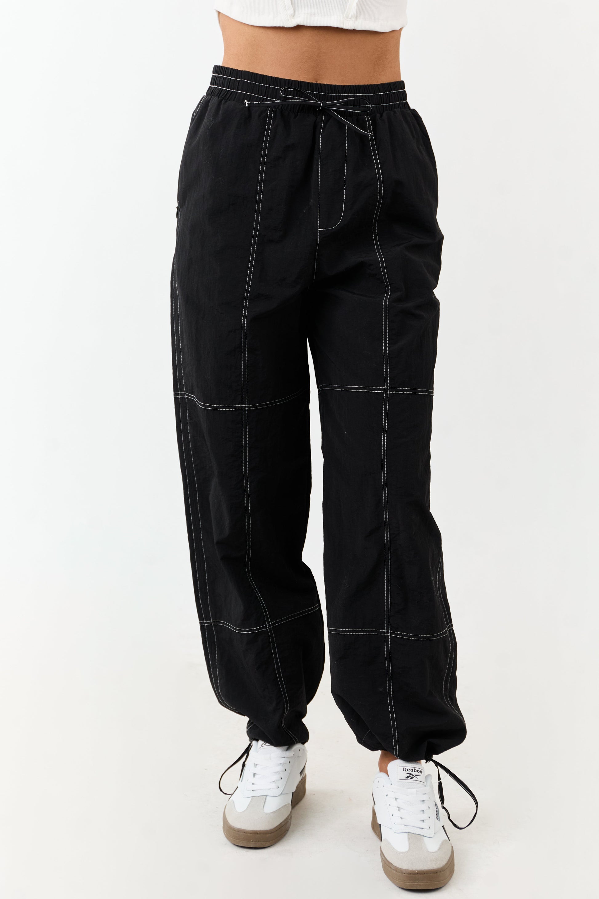 Black Contrast Stitch Wide Leg Drawstring Pants