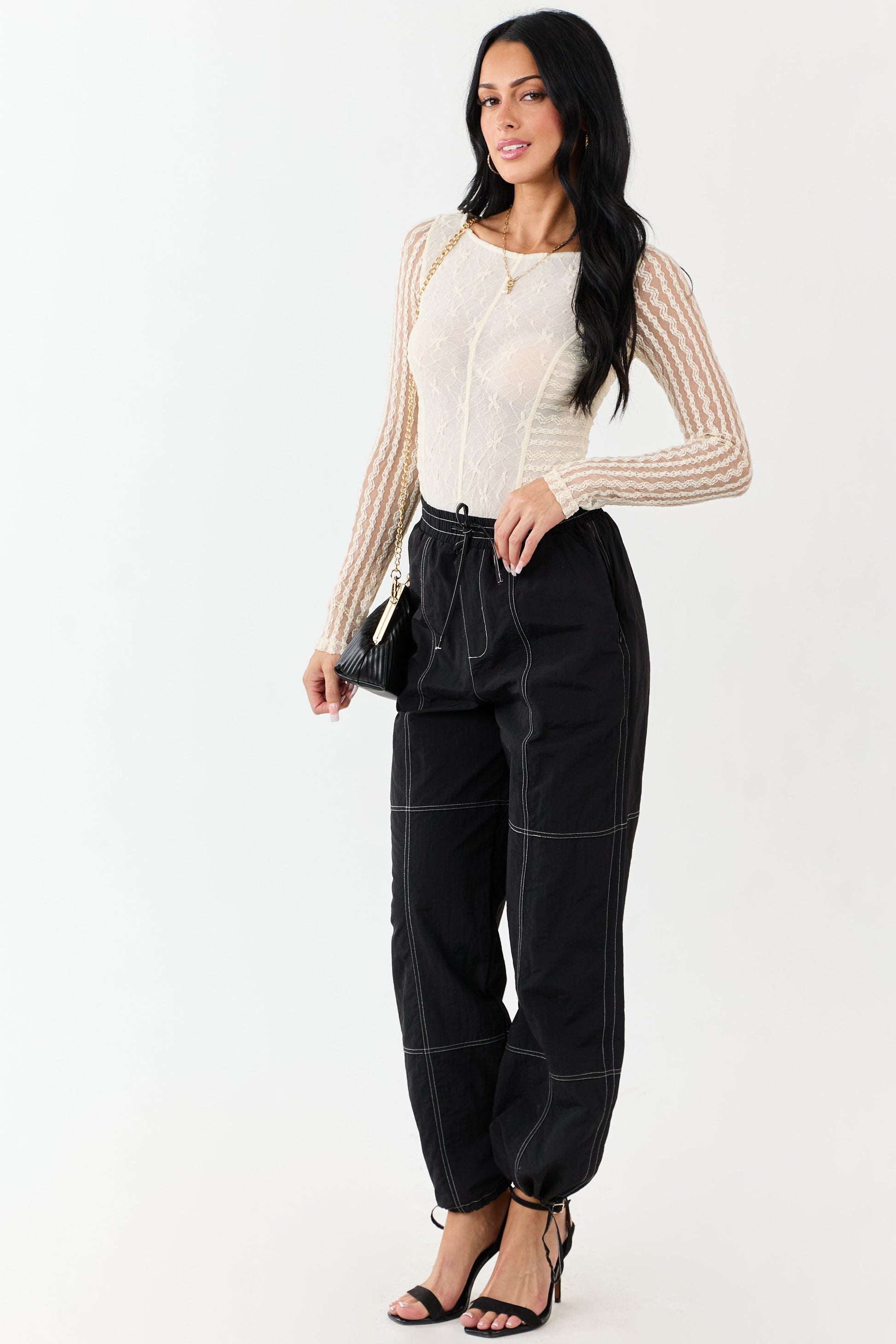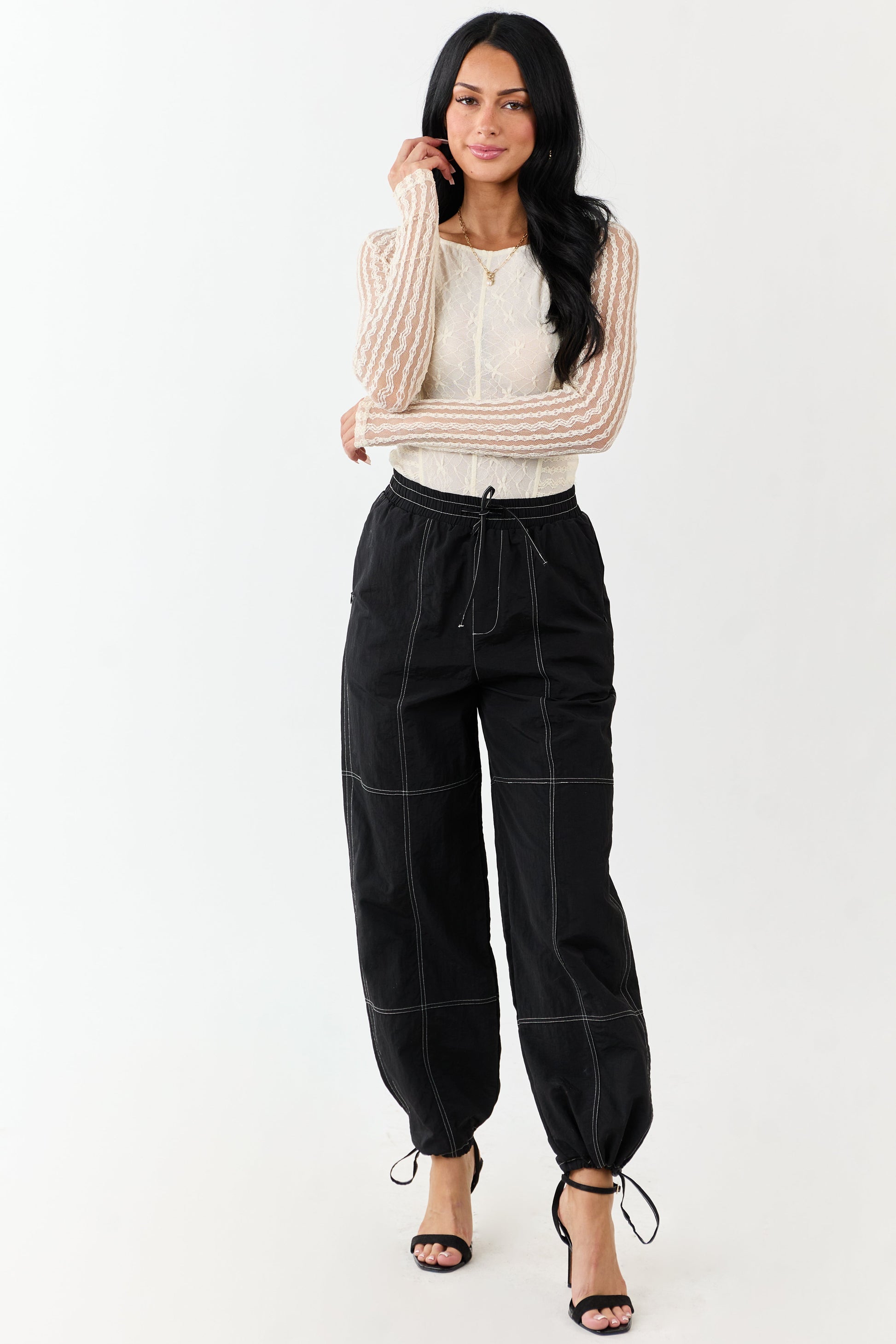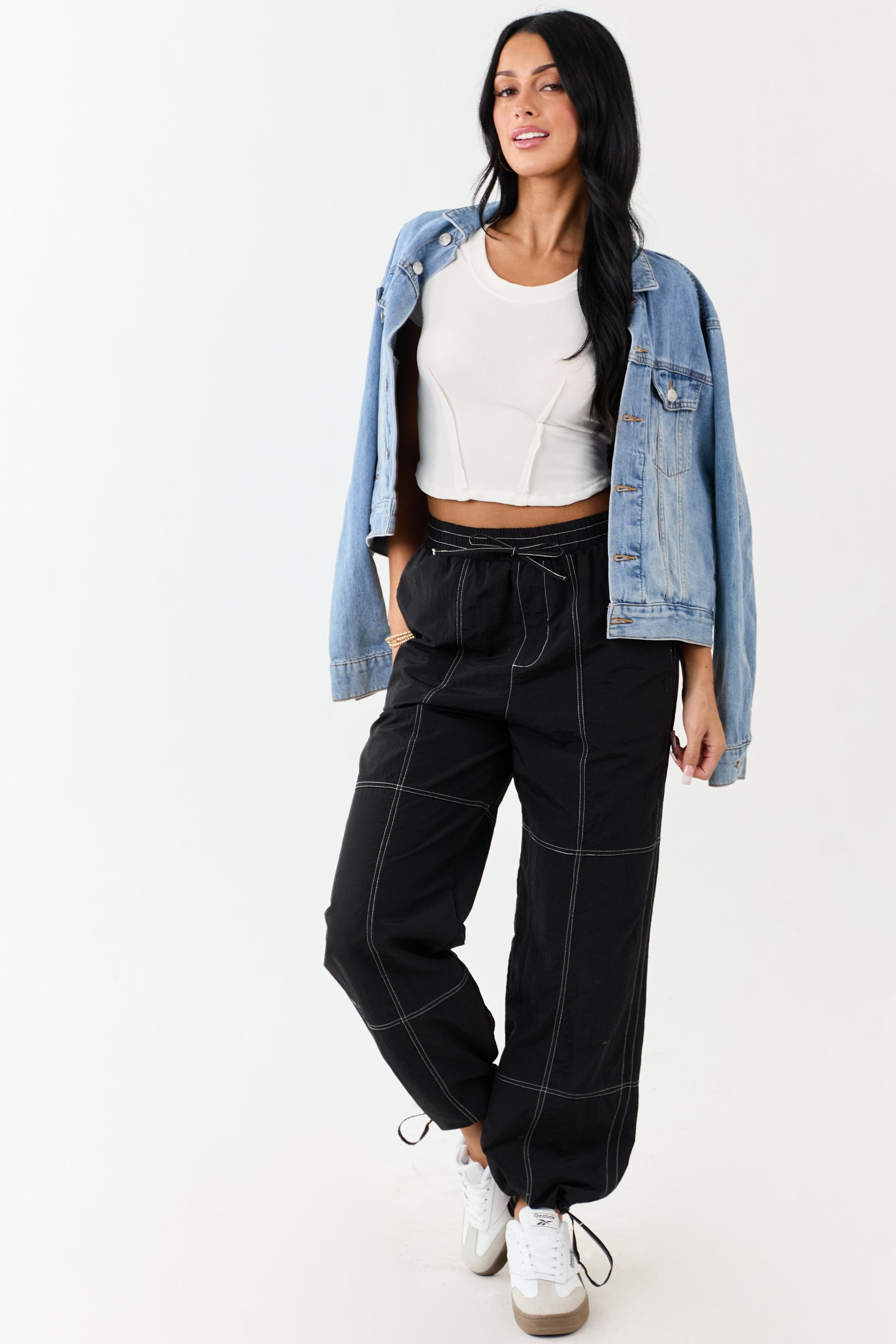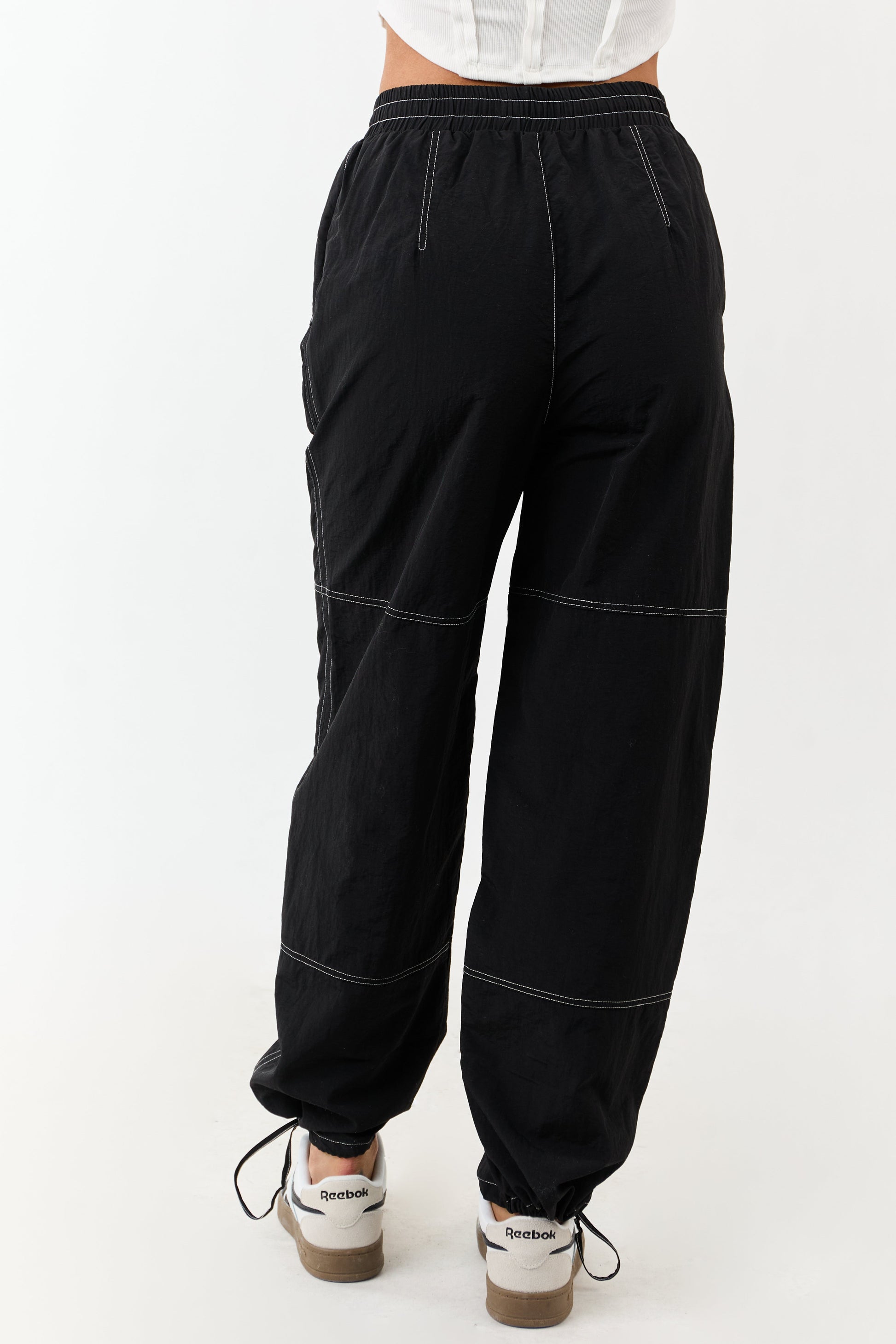 Black Contrast Stitch Wide Leg Drawstring Pants