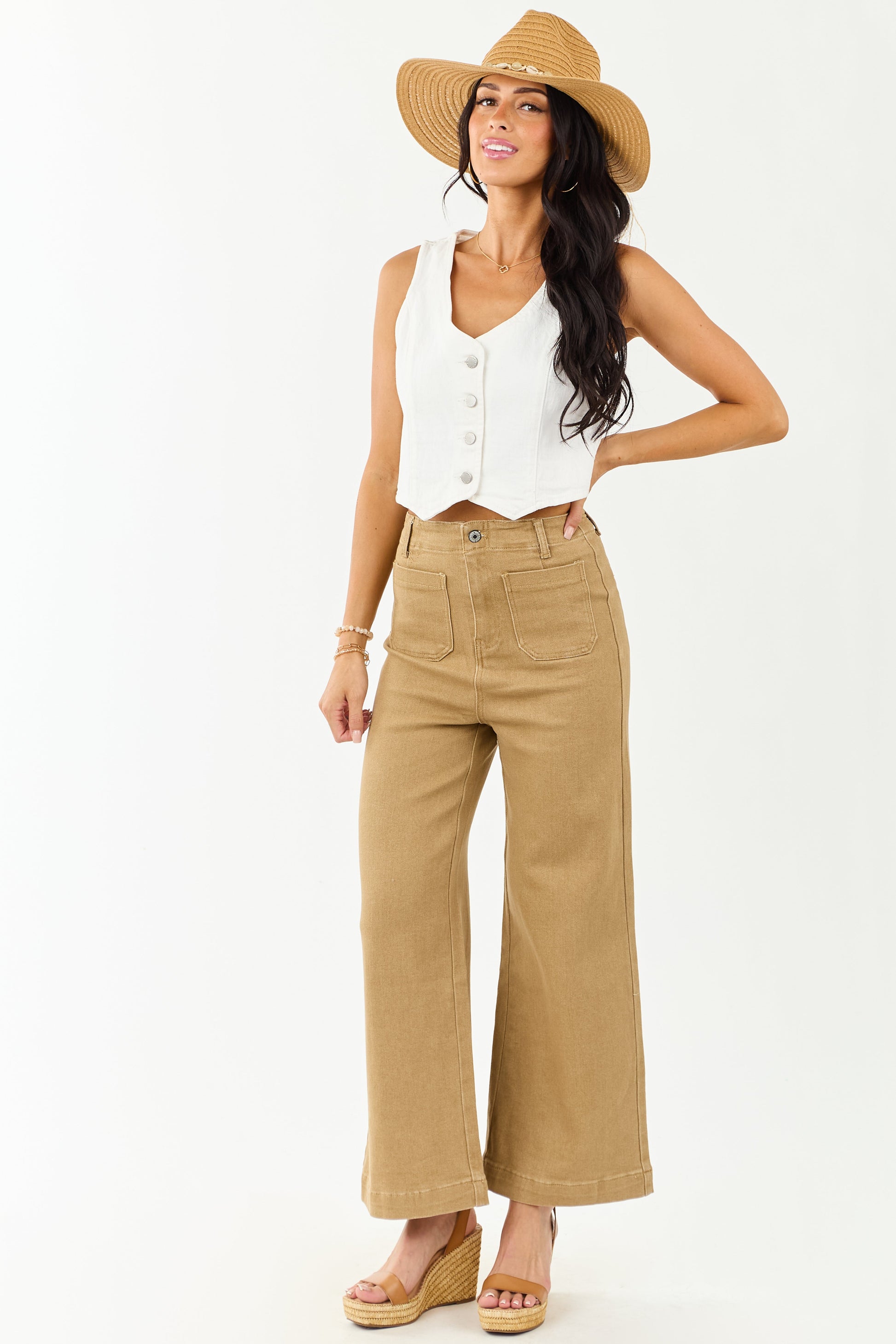 Lovelo Camel Patch Pocket High Rise Wide Leg Jeans