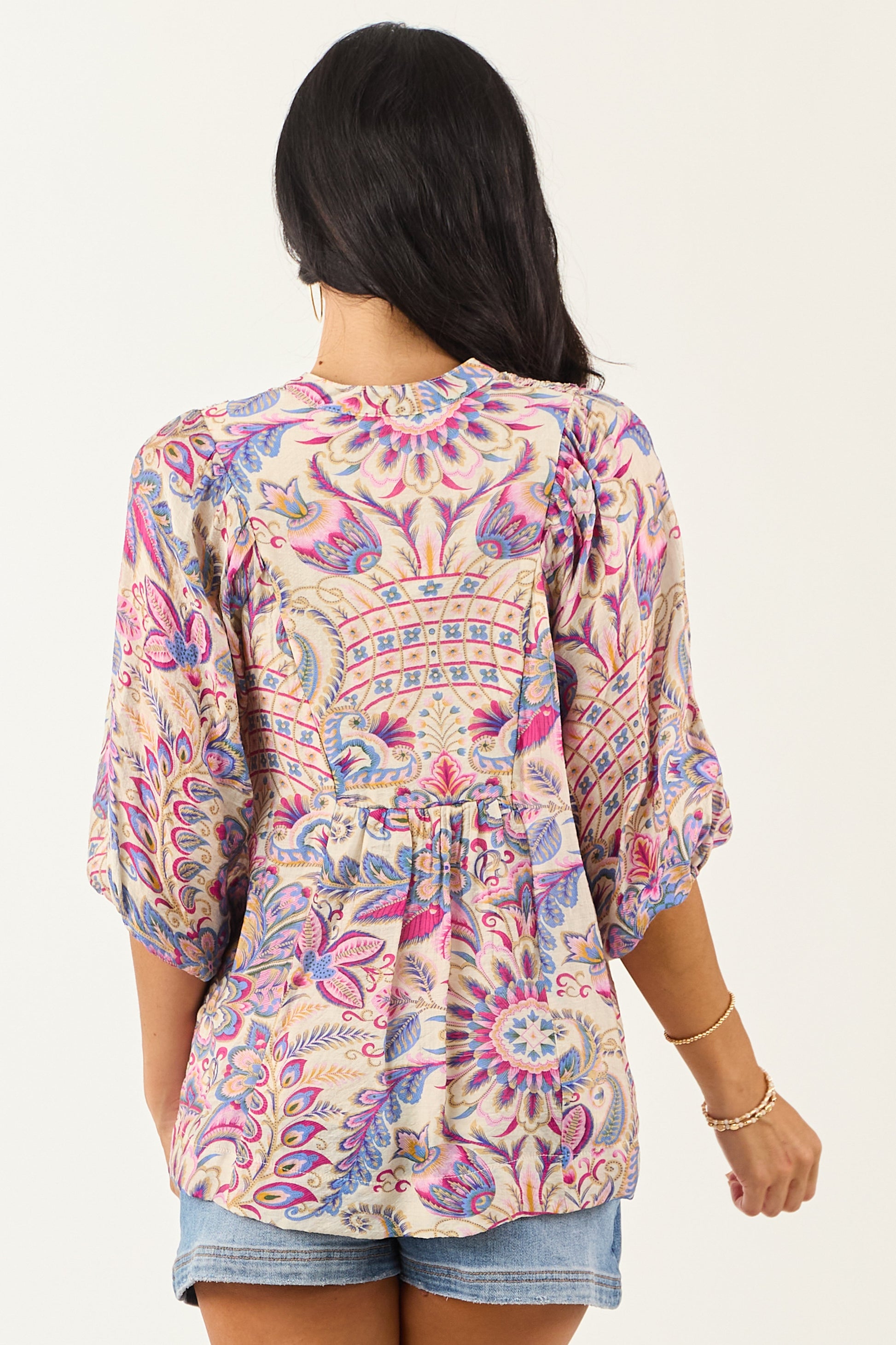 Almond Boho Scarf Print Relaxed Half Sleeve Top