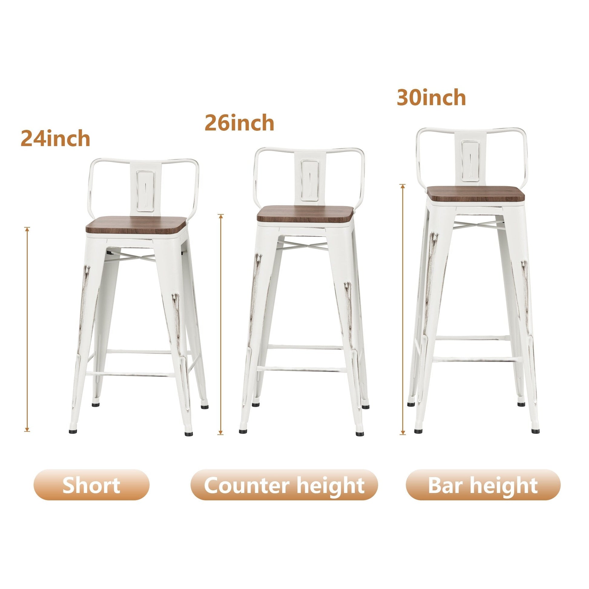 Upgrade your home or restaurant with the industrial style of these Bar Stools With Back. Each set includes four sturdy metal barstools with detachable backrests, making them easy to stack and store. Available in short, counter, and bar heights, these chairs are perfect for any dining or bar area. The wooden seats and durable electronic-sprayed finish make them both stylish and long-lasting, while the cross-bracing support and no-mar rubber feet ensure stability and floor protection.